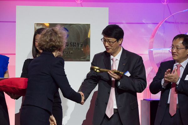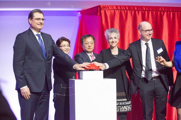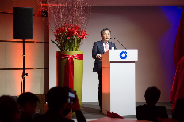 中国建设银行副行长庞秀生与嘉宾共同为苏黎世分行和瑞士人民币清算中心揭牌。
