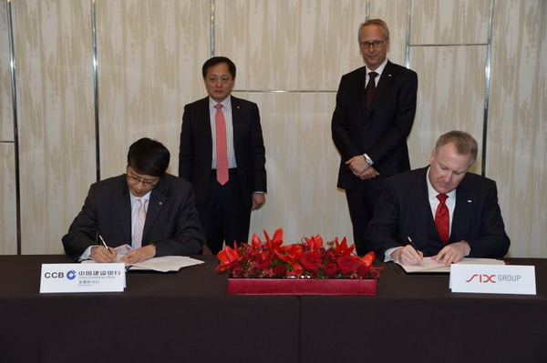 中国建设银行副行长庞秀生和瑞士交易所集团首席执行官乌尔斯•约格塞格博士见证苏黎世分行与瑞士交易所集团签署人民币业务合作备忘录。